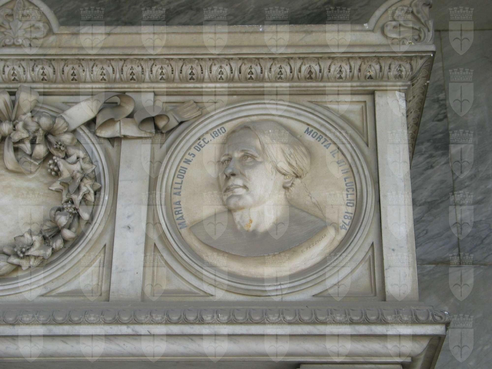 Un sarcofago poggiante su un basamento marmoreo è ornato da quattro tondi con, a bassorilievo, i ritratti dei membri della famiglia Allodi; sul fronte Giusto Giuseppe e Maria con al centro una ghirlanda di fiori, sui lati minori due ritratti maschili. Sulla destra Rodolfo Allodi e sulla sinistra Alberto Allodi.