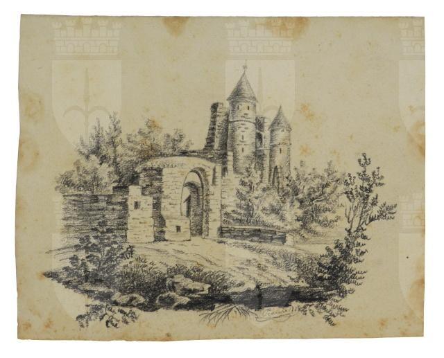 Disegno a matita raffigurante, in una cornice paesaggistica, un edificio simile a un castello, con due torri; in primo piano compare una porta di mura.