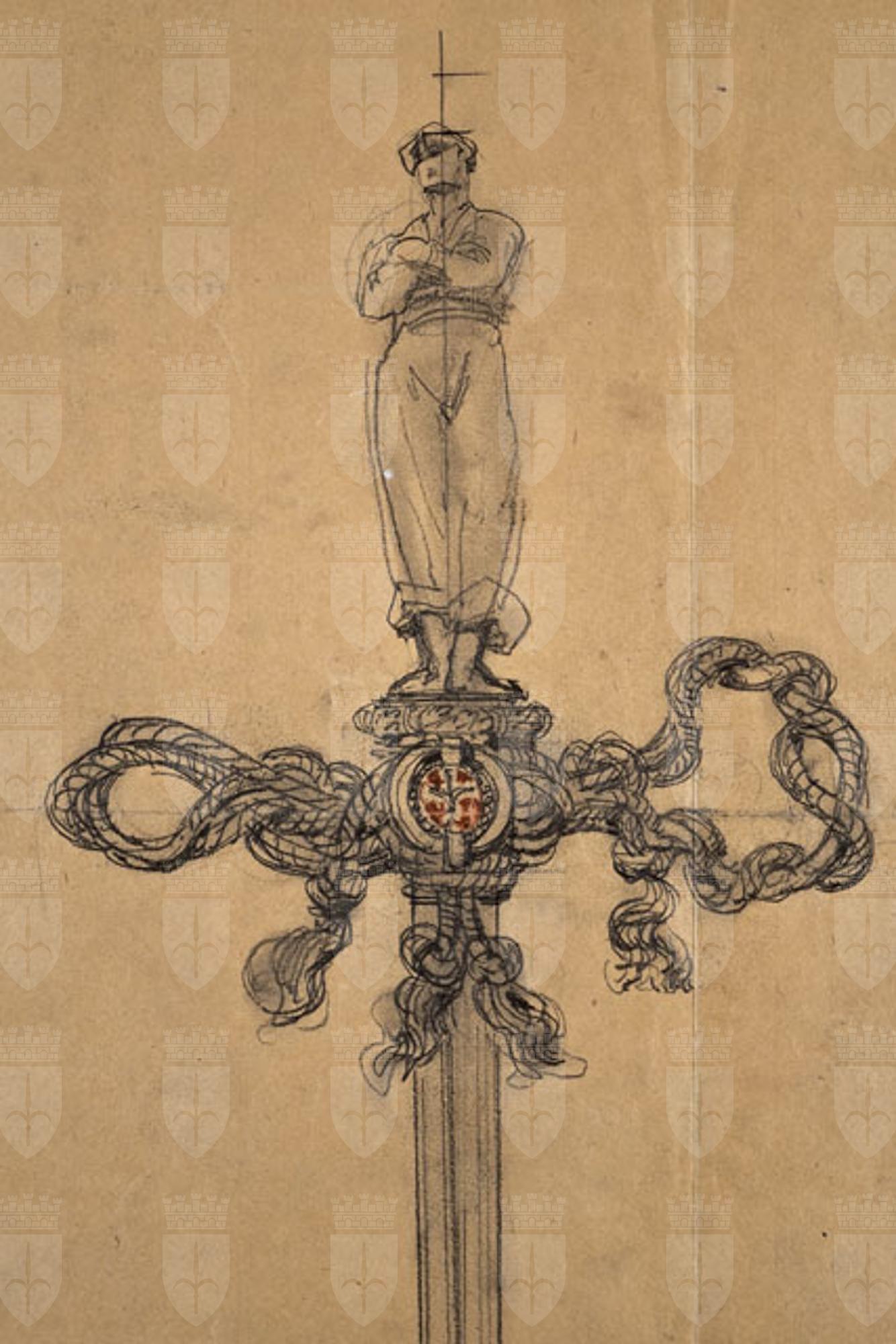 Si tratta di uno dei disegni progettuali del Faro della Vittoria, eseguiti da Arduino Berlam, che li donò ai Civici Musei di Storia ed Arte nel 1935, cfr. le schede da CMSAOAR06_3598 a CMSAOAR06_3634. In particolare, l'opera in esame testimonia le fasi ideative dello spadino d'onore donato dalla città di Trieste al grand'ammiraglio Paolo Camillo Thaon di Revel (Torino, 1859-Roma, 1948) il 3 febbraio 1924. Quest'ultimo, già capo di Stato Maggiore della Marina e comandante della flotta italiana durante la Grande Guerra, aveva donato al Comitato del Faro l'àncora del cacciatorpediniere Audace, che il 3 novembre 1918 aveva attraccato a Trieste, segnando la vittoria italiana sull'Impero austro-ungarico. Oltre all'àncora, l'ammiraglio consegnò la relativa catena e due proiettili della corazzata austroungarica "Viribus Unitis", affondata a Pola il 1° novembre 1918 (Zerboni 1999, pp. 72-75). Presso l'Archivio Generale del Comune di Trieste (Segreteria generale, prot.corr. 5/123-1923) si conserva il bozzetto definitivo della spada, eseguito da Arduino Berlam. Essa venne forgiata con una lama di baionetta della Brigata Sassari: l'impugnatura in argento ossidato era costituita dalla figura di marinaio che Giovanni Mayer aveva ipotizzato quale primo elemento decorativo del Faro, l'elsa composta da un intreccio di gomene a racchiudere lo stemma di Trieste in corallo con l'alabarda in platino. La statuetta venne fusa da Isidoro Bragadin di Venezia, mentre l'elsa dall'orefice Carlo Omet (cfr. Bigi - Guidi - Ugolini Bernasconi 2003, pp. 476-477).
