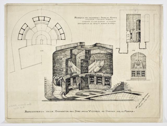 Si tratta di uno dei disegni progettuali del Faro della Vittoria, eseguiti da Arduino Berlam, che li donò ai Civici Musei di Storia ed Arte nel 1935, cfr. le schede da CMSAOAR06_3598 a CMSAOAR06_3634. In particolare, la tavola descrive l'adattamento delle casematte del Faro a ossario della Marina. A partire dal 1919, Arduino Berlam lavorò alla progettazione del Faro della Vittoria, architettura celebrativa e simbolica, che rispondeva al desiderio di esaltazione della patria e dell’italianità di Trieste redenta, sorto dopo la Grande Guerra, e alla necessità di onorare i suoi caduti. Già durante il conflitto, Berlam aveva ipotizzato di erigere un faro in onore di Nazario Sauro, eroe del mare, sulla punta istriana di Salvore, a poca distanza da Capodistria (cfr. CMSAOAR06_3631). Tuttavia questa prima idea fu modificata a guerra conclusa, quando la Lega navale propose di costruire il faro a Trieste, per sostituire l’obsoleta lanterna di Pietro Nobile. Dal giugno 1919, quando il progetto di massima venne approvato dal Consiglio Superiore dei Lavori Pubblici a Roma, al 1927, quando il faro fu inaugurato, il suo iter costruttivo fu tormentato da problemi e ritardi causati da divergenze di ordine tecnico-artistico e dall’antagonismo contro Arduino Berlam. Edificato sulle fondamenta del forte austriaco Kressich, costruito sul colle di Gretta nel 1854, su progetto dell'architetto Karl Möring, il faro presenta una gradinata monumentale alla cui sommità si trova un solettone. Su di esso è posta la lapide con l'epigrafe dedicatoria «A. D. MCMXXVII / SPLENDI E RICORDA / I CADUTI SUL MARE / MCMXV – MCMXVIII». Il manufatto prosegue con uno zoccolo a campana da cui pende l'àncora del caccia-torpediniere Audace, che il 3 novembre 1918 attraccò sul molo triestino ad esso intitolato. Sull'avancorpo del ballatoio, da cui si innalza il fusto della colonna, poggia la statua del Marinaio ignoto, eseguita da Giovanni Mayer. La colonna, in cemento armato, è rivestita da blocchi di pietra di Orsera e termina con un capitello che sorregge il terrazzo su cui poggia la lanterna. Quest'ultima è circondata da un ulteriore ballatoio in ferro ed è coronata da una cupola di rame a squame, su cui svetta una Vittoria alata, opera anch'essa di Mayer, forgiata da Giacomo Sreboth.