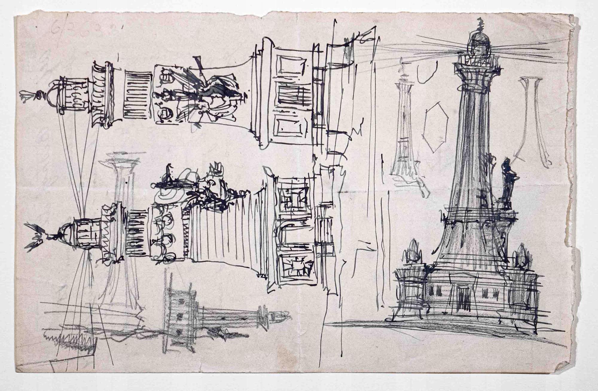 Il foglio contiene, al recto e al verso, numerosi schizzi a matita e a penna per un faro. Sul verso del foglio, appunti a penna (cfr. iscrizioni).