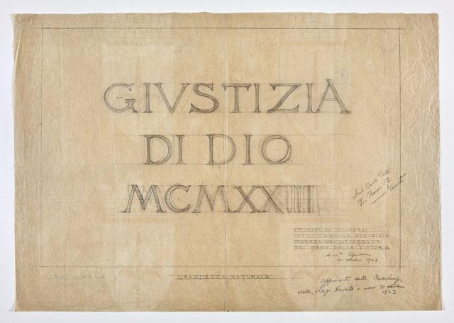 Progetto per un'epigrafe da incidersi, come recita l'iscrizione, sotto l'aquila austriaca murata nei sotterranei del Faro della Vittoria. Eseguito dall'architetto Arduino Berlam il 30 ottobre 1923, fu approvato dalla Presidenza della Lega Navale il giorno successivo. Si tratta di uno dei disegni progettuali del Faro della Vittoria, donati da Arduino Berlam ai Civici Musei di Storia ed Arte nel 1935, cfr. schede da CMSAOAR06_3598 a CMSAOAR06_3634. Per le vicende storico-critiche del Faro della Vittoria, si rinvia alla scheda CMSAOAR06_3598.