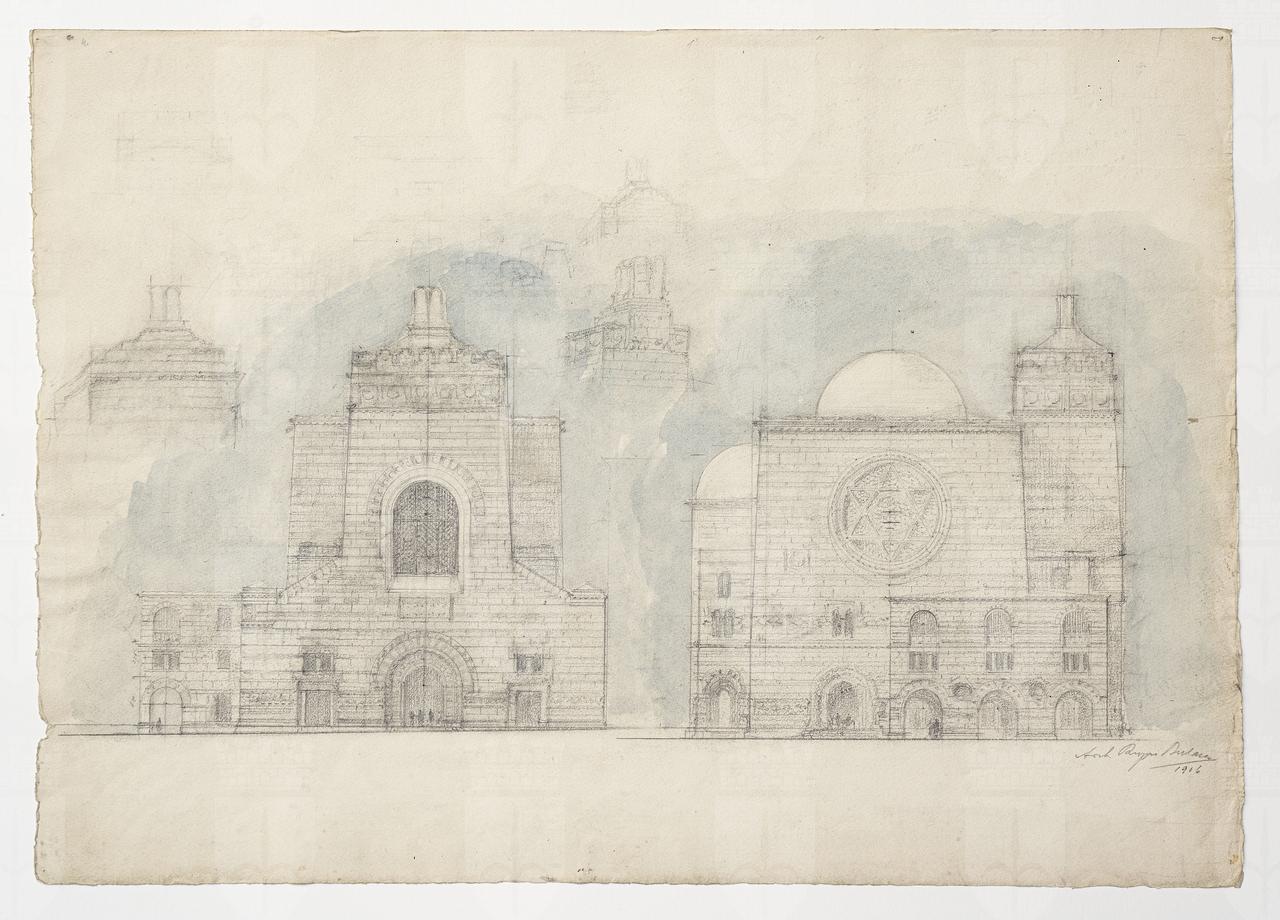 Progetto per la Sinagoga di Trieste: prospetto della facciata su via Donizetti e sulla via San Francesco d'Assisi. Sul foglio ci sono anche alcuni schizzi con dettagli.