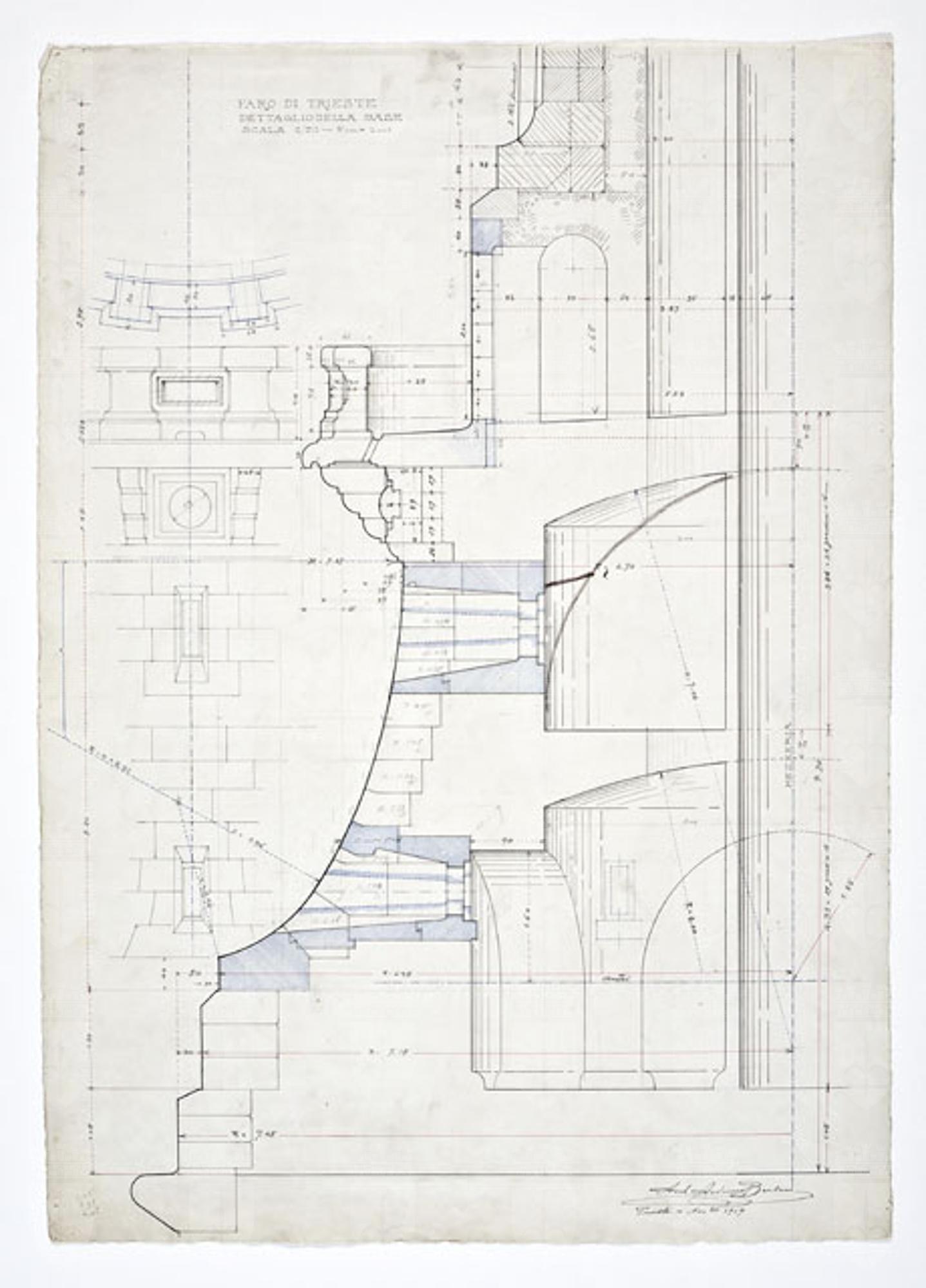 Si tratta di uno dei disegni progettuali del Faro della Vittoria, eseguiti da Arduino Berlam, che li donò ai Civici Musei di Storia ed Arte nel 1935, cfr. le schede da CMSAOAR06_3599 a CMSAOAR06_3634. In particolare, la tavola, già pubblicata nel 1919, sulle pagine de "L’architettura italiana", descrive nel dettaglio parte della base su cui si sarebbe impostato il fusto del faro. Proprio a partire da quell’anno, Arduino Berlam lavorò alla progettazione del Faro della Vittoria, architettura celebrativa e simbolica, che rispondeva al desiderio di esaltazione della patria e dell’italianità di Trieste redenta, sorto dopo la Grande Guerra, e alla necessità di onorare i suoi caduti. Già durante il conflitto, Berlam aveva ipotizzato di erigere un faro in onore di Nazario Sauro, eroe del mare, sulla punta istriana di Salvore, a poca distanza da Capodistria (cfr. CMSAOAR06_3631). Tuttavia questa prima idea fu modificata a guerra conclusa, quando la Lega navale propose di costruire il faro a Trieste, per sostituire l’obsoleta lanterna di Pietro Nobile. Dal giugno 1919, quando il progetto di massima venne approvato dal Consiglio Superiore dei Lavori Pubblici a Roma, al 1927, quando il faro fu inaugurato, il suo iter costruttivo fu tormentato da problemi e ritardi causati da divergenze di ordine tecnico-artistico e dall’antagonismo contro Arduino Berlam. Edificato sulle fondamenta del forte austriaco Kressich, costruito sul colle di Gretta nel 1854, su progetto dell'architetto Karl Möring, il faro presenta una gradinata monumentale alla cui sommità si trova un solettone. Su di esso è posta la lapide con l'epigrafe dedicatoria «A. D. MCMXXVII / SPLENDI E RICORDA / I CADUTI SUL MARE / MCMXV – MCMXVIII». Il manufatto prosegue con uno zoccolo a campana da cui pende l'àncora del caccia-torpediniere Audace, che il 3 novembre 1918 attraccò sul molo triestino ad esso intitolato. Sull'avancorpo del ballatoio, da cui si innalza il fusto della colonna, poggia la statua del Marinaio ignoto, eseguita da Giovanni Mayer. La colonna, in cemento armato, è rivestita da blocchi di pietra di Orsera e termina con un capitello che sorregge il terrazzo su cui poggia la lanterna. Quest'ultima è circondata da un ulteriore ballatoio in ferro ed è coronata da una cupola di rame a squame, su cui svetta una Vittoria alata, opera anch'essa di Mayer, forgiata da Giacomo Sreboth.