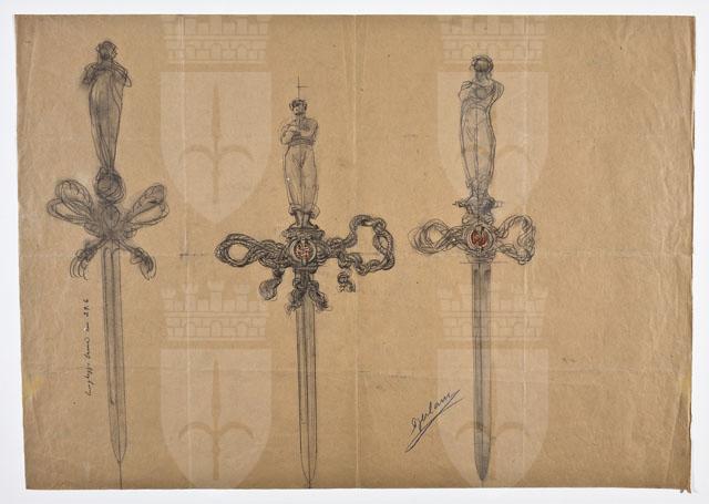 Il foglio contiene tre studi per uno spadino con elsa composta da gomene intrecciate, racchiudenti un comparto circolare con stemma della città di Trieste, e impugnatura a guisa di marinaio con le braccia conserte.
