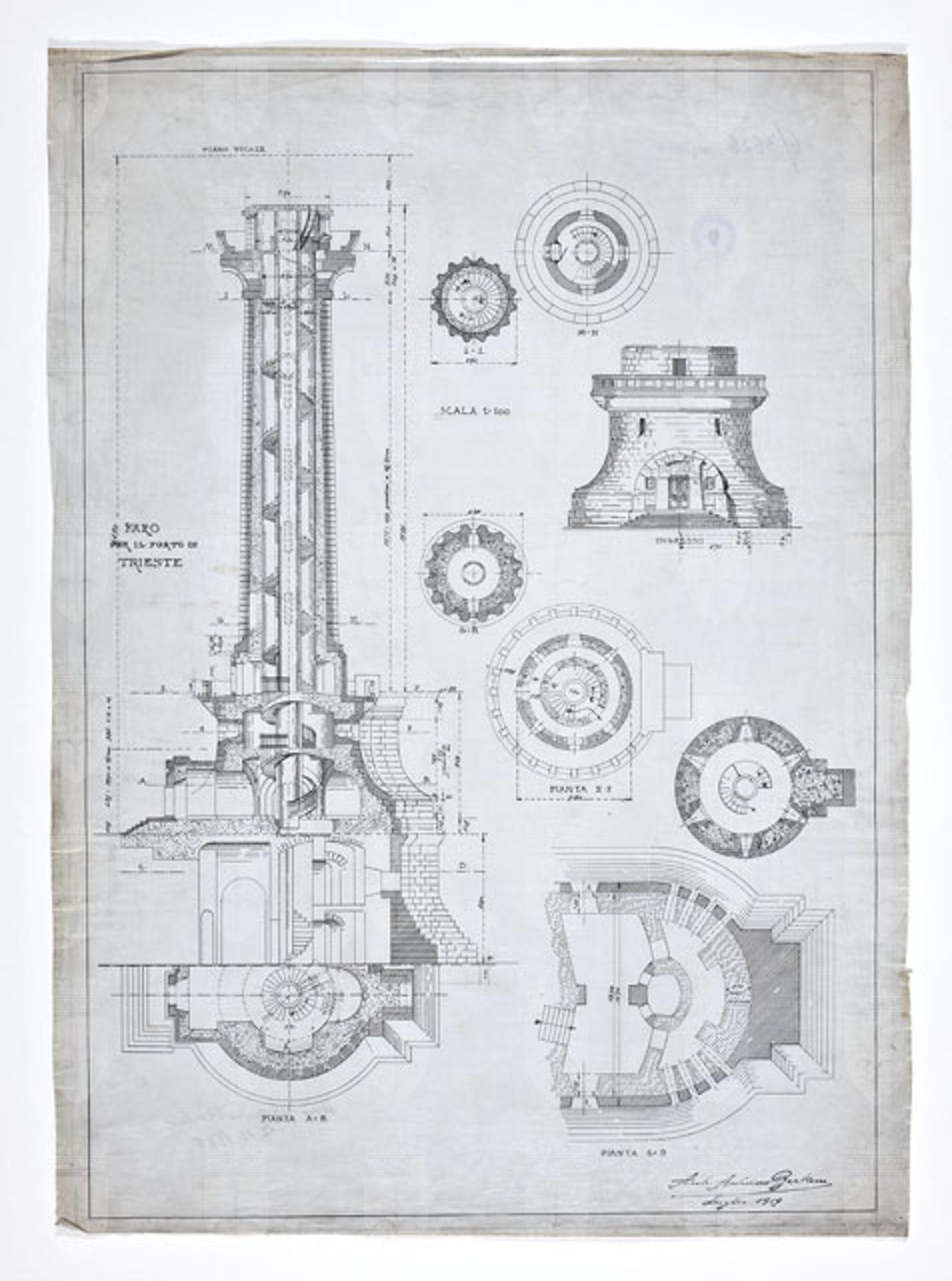 Entro linea di margine, disegno quotato raffigurante la sezione in alzato del Faro della Vittoria fino al secondo ballatoio con planimetrie relative a diverse altezze dello spaccato, indicate con lettere dell'alfabeto; alzato dello zoccolo a campana con accesso al Faro. Scala 1/100.