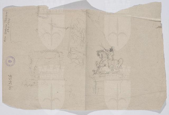 Schizzo del monumento in onore di Vittorio Emanuele II. Sul recto, abbozzo generale del monumento e dettagli architettonici; sul verso, studio per la statua equestre e il suo basamento.