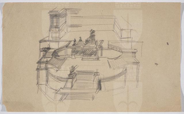 Sul recto, schizzo a matita raffigurante veduta prospettica del monumento in onore di Vittorio Emanuele II. Sul verso, altro studio del monumento, schizzo della planimetria delle prime due piattaforme e altri dettagli architettonici.