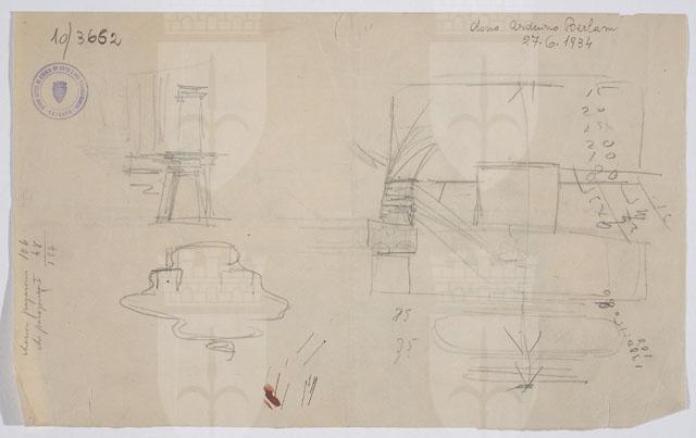 Sul recto, schizzi prospettici del monumento in onore di Vittorio Emanuele II; sul verso, studi non identificabili e calcoli matematici.