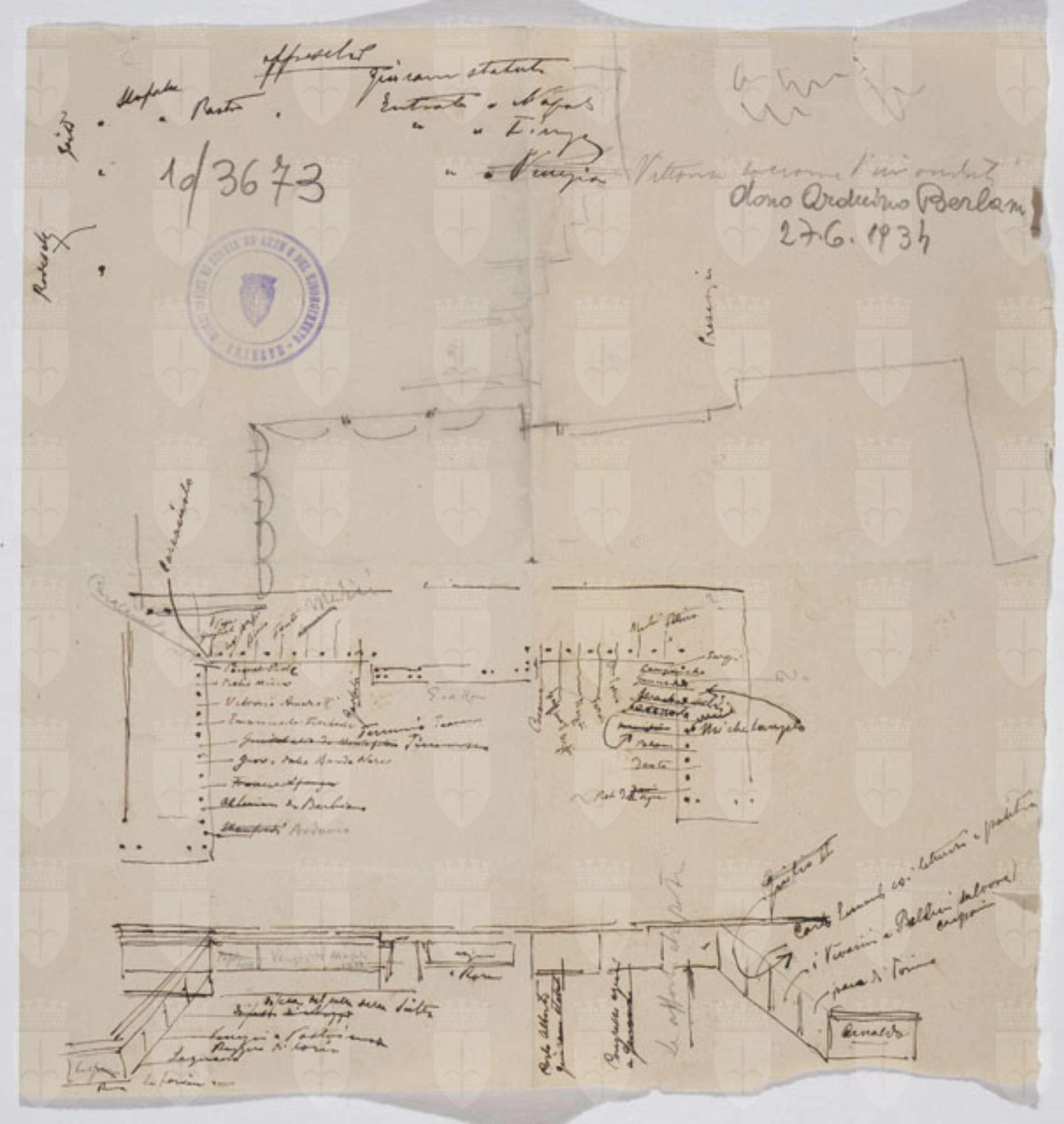 Il disegno fa parte di una serie di studi per il Monumento nazionale a Vittorio Emanuele II, cfr. schede CMSAOAR10_3646-CMSAOAR10_3688. Ruggero Berlam partecipò al secondo concorso per il monumento a Vittorio Emanuele II a Roma, indetto dal momento che la prima selezione, svoltasi nel 1880, non ebbe un vincitore. Nel primo bando l’unico vincolo posto ai progettisti era stato quello del costo; il secondo, pubblicato il 18 dicembre 1882, prevedeva di collocare il monumento sul colle Capitolino e ne fissava alcune caratteristiche: un fondale architettonico e una statua di Vittorio Emanuele II, dapprima seduto su un trono, poi a cavallo. Secondo Sticotti, Berlam inviò il progetto in incognito da Milano, per non essere riconosciuto come austriaco; ma dopo esser stato esposto a Roma, esso fu fatto sparire, su volontà del primo ministro Agostino Depretis, per non turbare i rapporti che si erano creati con l’Austria. Il concorso, cui parteciparono 98 progettisti, fu vinto da Giuseppe Sacconi, con un progetto che presenta affinità con quello di Ruggero Berlam; secondo classificato Manfredo Manfredi, terzo Bruno Schmitz. In seguito, vi fu un terzo bando ristretto ai primi tre classificati, vinto da Sacconi. Il progetto di Berlam, incentrato su purezza e classicità di linee (Marsoni 1986, p. 112), presenta una parte basamentale forte e compatta, alta la metà del monumento, che non avrebbe consentito di vedere il colonnato dalla Piazza Venezia, ma solo da via del Corso: un errore progettuale fatale, che, secondo Pozzetto, ne sancì l’eliminazione (1999, pp. 90-91). Il disegno in esame presenta uno schizzo del sotto-basamento del monumento equestre, sul recto; mentre il verso è dedicato all'organizzazione dei gruppi scultorei di uomini illustri posti all'ombra del monumentale colonnato (cfr. il prospetto definitivo in Pozzetto 1999, pp. 90-91, figg. 152-153).