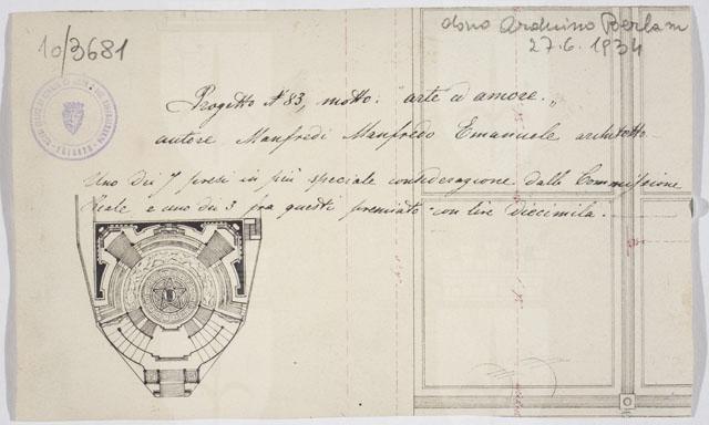 Il disegno è annesso alla serie di studi per il Monumento nazionale a Vittorio Emanuele II, cfr. schede CMSAOAR10_3646-CMSAOAR10_3688, eseguiti da Ruggero Berlam. Egli partecipò al secondo concorso per il monumento a Vittorio Emanuele II a Roma, indetto dal momento che la prima selezione, svoltasi nel 1880, non ebbe un vincitore. Nel primo bando l’unico vincolo posto ai progettisti era stato quello del costo; il secondo, pubblicato il 18 dicembre 1882, prevedeva di collocare il monumento sul colle Capitolino e ne fissava alcune caratteristiche: un fondale architettonico e una statua di Vittorio Emanuele II, dapprima seduto su un trono, poi a cavallo. Secondo Sticotti, Berlam inviò il progetto in incognito da Milano, per non essere riconosciuto come austriaco; ma dopo esser stato esposto a Roma, esso fu fatto sparire, su volontà del primo ministro Agostino Depretis, per non turbare i rapporti che si erano creati con l’Austria. Il concorso, cui parteciparono 98 progettisti, fu vinto da Giuseppe Sacconi, con un progetto che presenta affinità con quello di Ruggero Berlam; secondo classificato Manfredo Manfredi, terzo Bruno Schmitz. In seguito, vi fu un terzo bando ristretto ai primi tre classificati, vinto da Sacconi. Quanto al disegno in esame, si tratta di una copia del progetto N. 83 presentato da Emanuele Manfredo Manfredi e selezionato tra i primi tre dalla Commissione Reale, che lo premiò con diecimila lire.