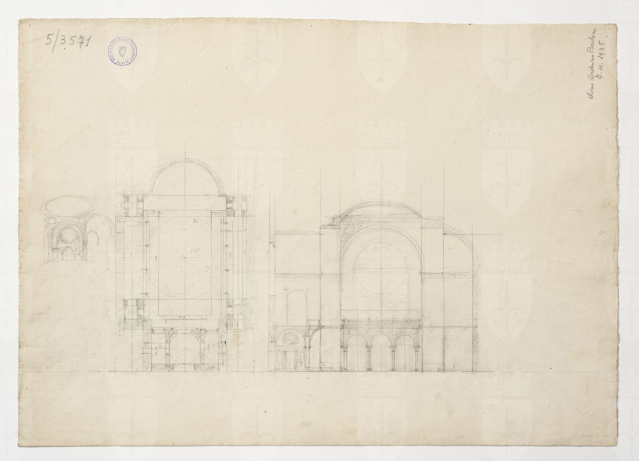Tavola progettuale per la Sinagoga di Trieste, raffigurante la facciata principale e quella laterale.