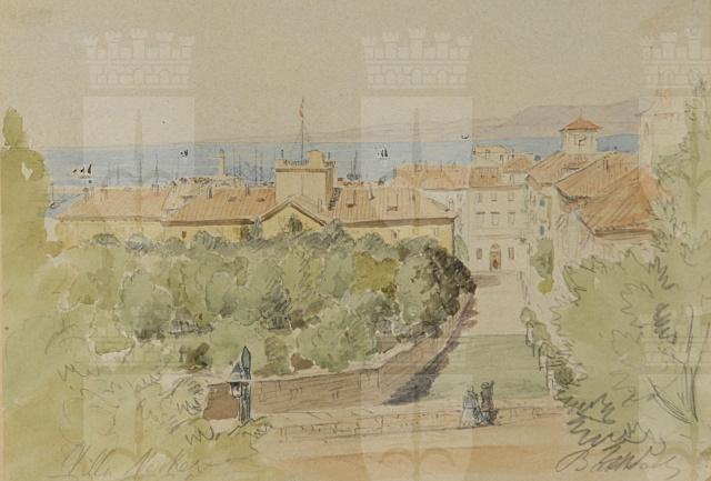 Acquerello raffigurante una veduta di Trieste dal colle di San Vito con, in primo piano sulla sinistra, la villa Necker.