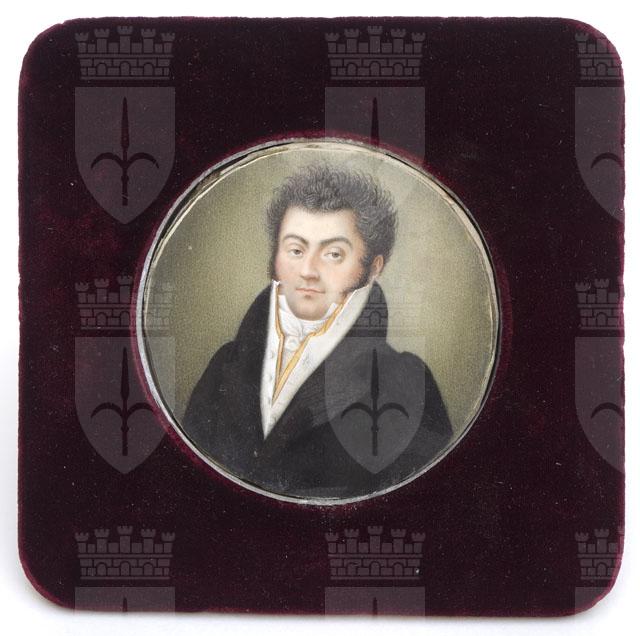 Miniatura di formato tondo che ritrae a mezzo busto un uomo, rivolto di tre quarti verso sinistra. L’abbigliamento e l’acconciatura suggeriscono una datazione verso gli anni trenta del XIX secolo.