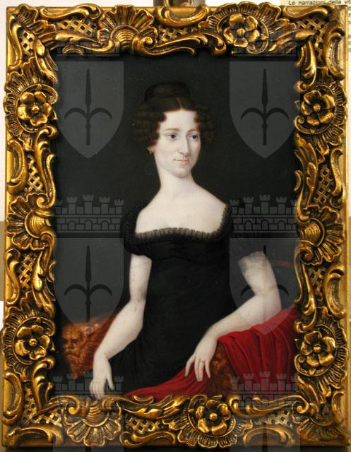 In questa miniatura Maria Margherita de’ Zanchi (Trieste, 1776-1863) sfoggia un abito stile impero, confezionato in velluto nero, che si caratterizza per la tipica vita segnata alta, appena sotto il seno, e le corte maniche a palloncino. Attorno all'ampio scollo quadrato è inoltre applicato un piccolissimo volant in pizzo che incornicia il décolleté. La baronessa è seduta su una poltrona a pozzetto con protomi leonine a guisa di braccioli, sulla quale è poggiato uno scialle rosso. La foggia dell’abito e l’acconciatura consentono di datare l’opera al secondo decennio del XIX secolo. Della contessa nelle collezioni del Civici Musei di Storia ed Arte si conservano altre effigi, cfr. inv. 13/4883, 13/4884 e 13/4893.