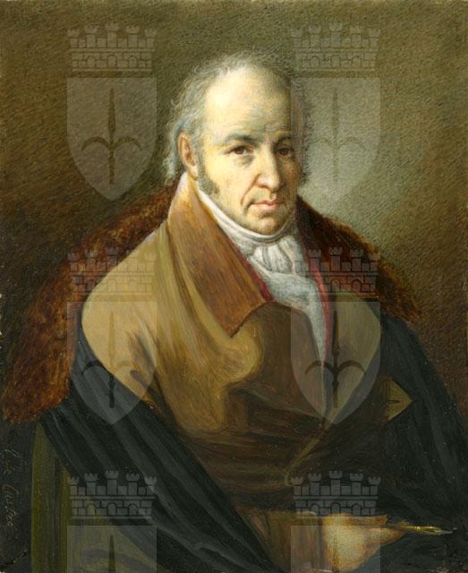 La miniatura ritrae il pittore friulano Giuseppe Bernardino Bison (Palmanova, 1762-Milano, 1844), che, formatosi all’Accademia di Venezia, si trasferì nel 1802 a Trieste, luogo a cui si lega il periodo più fortunato della sua carriera artistica. Oltre a dedicarsi alla pittura da cavalletto, nella città giuliana affrescò la sala rotonda di palazzo Carciotti (1803-04), la gran sala del palazzo della Borsa Vecchia (1805-06) e i pennacchi della cupola della chiesa di Santa Maria Maggiore (1817). Per un profilo aggiornato su Bison, si rinvia a Pavanello, Craievich, D’Anza 2012. L’opera in esame, firmata Andrea de Castro (Pirano, 1806-Trieste, 1884), è strettamente legata all'effigie del pittore friulano dipinta da Giuseppe Tominz attorno alla fine degli anni venti dell’Ottocento, ed esposta in occasione della sua mostra personale nel 1830. Una copia del ritratto di Giuseppe Tominz si conserva al Museo Revoltella di Trieste (inv. 94; Quinzi 2011, p. 224, cat. DE17).