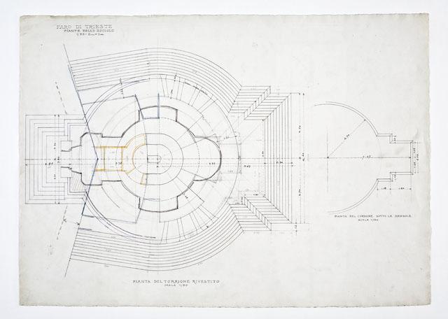 Si tratta di uno dei disegni progettuali del Faro della Vittoria, eseguiti da Arduino Berlam, che li donò ai Civici Musei di Storia ed Arte nel 1935, cfr. le schede da CMSAOAR06_3598 a CMSAOAR06_3634. In particolare, la tavola descrive le planimetrie dello zoccolo a campana, ossia del torrione rotondo rivestito e del cordone sotto le mensole. A partire dal 1919, Arduino Berlam lavorò alla progettazione del Faro della Vittoria, architettura celebrativa e simbolica, che rispondeva al desiderio di esaltazione della patria e dell’italianità di Trieste redenta, sorto dopo la Grande Guerra, e alla necessità di onorare i suoi caduti. Già durante il conflitto, Berlam aveva ipotizzato di erigere un faro in onore di Nazario Sauro, eroe del mare, sulla punta istriana di Salvore, a poca distanza da Capodistria (cfr. CMSAOAR06_3631). Tuttavia questa prima idea fu modificata a guerra conclusa, quando la Lega navale propose di costruire il faro a Trieste, per sostituire l’obsoleta lanterna di Pietro Nobile. Dal giugno 1919, quando il progetto di massima venne approvato dal Consiglio Superiore dei Lavori Pubblici a Roma, al 1927, quando il faro fu inaugurato, il suo iter costruttivo fu tormentato da problemi e ritardi causati da divergenze di ordine tecnico-artistico e dall’antagonismo contro Arduino Berlam. Edificato sulle fondamenta del forte austriaco Kressich, costruito sul colle di Gretta nel 1854, su progetto dell'architetto Karl Möring, il faro presenta una gradinata monumentale alla cui sommità si trova un solettone. Su di esso è posta la lapide con l'epigrafe dedicatoria «A. D. MCMXXVII / SPLENDI E RICORDA / I CADUTI SUL MARE / MCMXV – MCMXVIII». Il manufatto prosegue con uno zoccolo a campana da cui pende l'àncora del caccia-torpediniere Audace, che il 3 novembre 1918 attraccò sul molo triestino ad esso intitolato. Sull'avancorpo del ballatoio, da cui si innalza il fusto della colonna, poggia la statua del Marinaio ignoto, eseguita da Giovanni Mayer. La colonna, in cemento armato, è rivestita da blocchi di pietra di Orsera e termina con un capitello che sorregge il terrazzo su cui poggia la lanterna. Quest'ultima è circondata da un ulteriore ballatoio in ferro ed è coronata da una cupola di rame a squame, su cui svetta una Vittoria alata, opera anch'essa di Mayer e forgiata da Giacomo Sreboth.