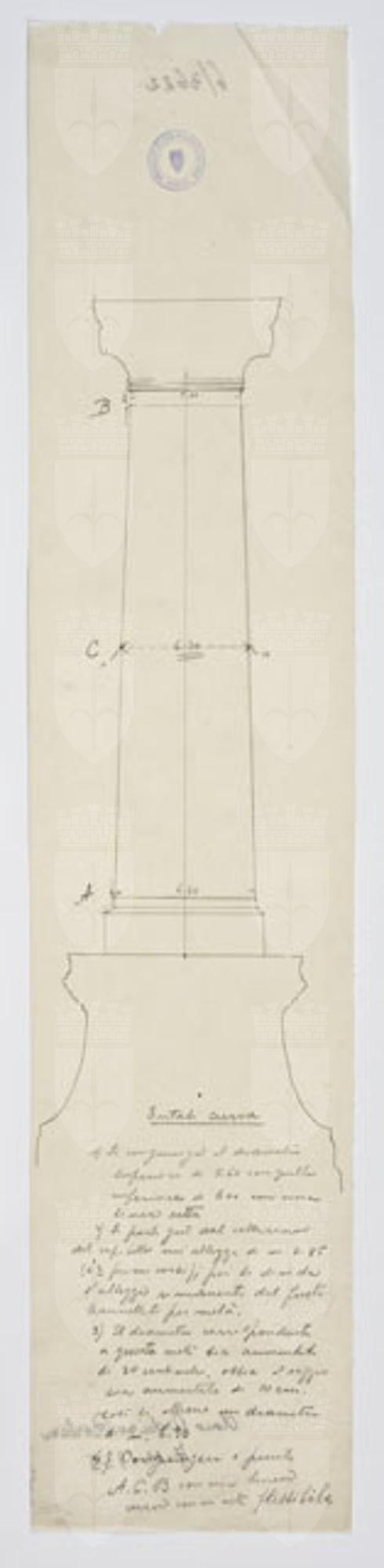 Disegno a matita. Nella parte superiore del foglio: alzato di colonna, poggiante su alto basamento, con indicati tre punti con le lettere A,B,C; nella parte inferiore: lunga iscrizione.