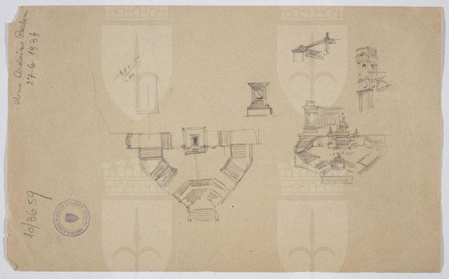 Sul recto, schizzo a matita raffigurante veduta prospettica del monumento in onore di Vittorio Emanuele II. Sul verso, altro studio del monumento, schizzo della planimetria delle prime due piattaforme e altri dettagli architettonici.