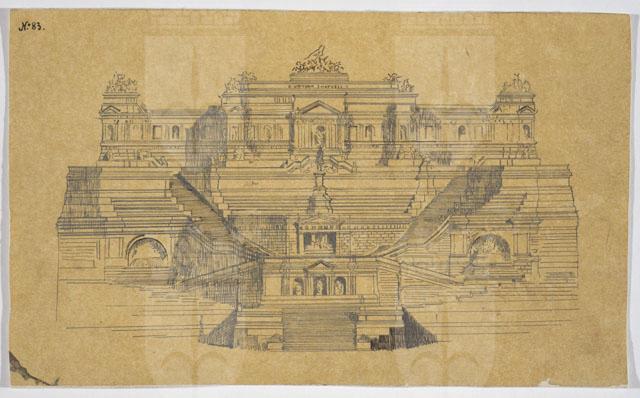 Copia del progetto N. 83 del monumento da erigersi a Roma in onore di Vittorio Emanuele II, su carta da lucido, applicata su carta. Sul verso, semiplanimetria del monumento stesso e tracce di altra planimetria (il foglio è un frammento di riuso).
