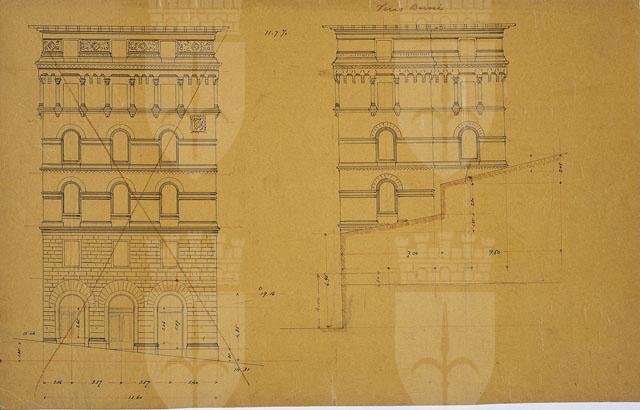 Tavola raffigurante i prospetti di due lati corti di edificio: quello a sinistra è quotato e barrato; quello a destra, presenta inoltre le misure dell'ingombro della costruzione contigua. Sul verso, rilievo topografico dell'area di via Benedetto Marcello e calcoli matematici.