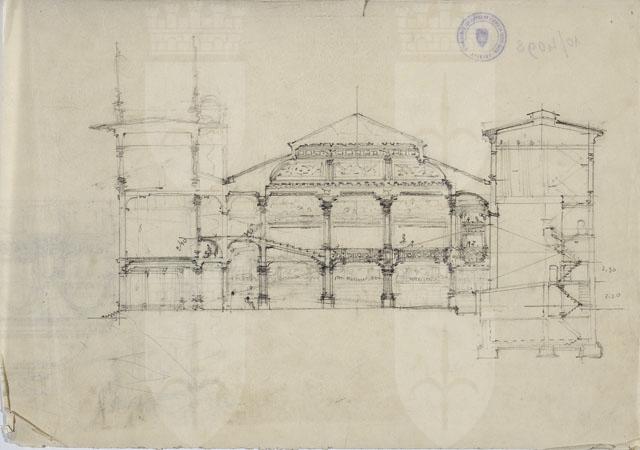 Disegno parzialmente quotato raffigurante spaccato di cine-teatro, sul recto; dettaglio dello stesso spaccato, sul verso.