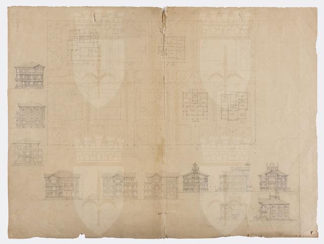 Tavola contenente studi di prospetti e planimetrie per villino a due o tre livelli. Nelle planimetrie, studio della distribuzione degli edifici con definizione della destinazione d'uso (scritte all'interno dei locali).