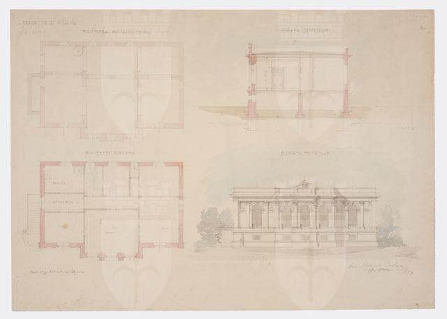 Tavola a matita e acquerello policromo, raffigurante un progetto per un villino a due livelli (piano semisotterraneo e piano elevato). Essa contiene le planimetrie dei due piani (in qualche locale è indicata con scritte la destinazione d'uso), la sezione trasversale e il prospetto della facciata principale.