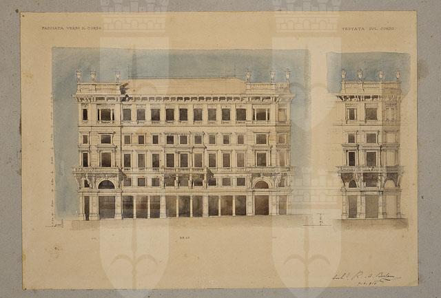 Disegno a matita, penna e acquerello, parzialmente quotato, raffigurante il prospetto della facciata verso il Corso e il dettaglio della testata verso il Corso.
