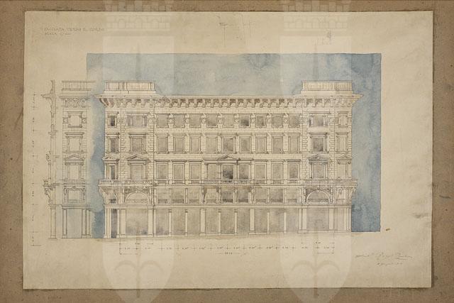 Il disegno in esame appartiene al "Progetto per l'edificio della Riunione Adriatica di Sicurtà", cfr. schede CMSAOAR10_4176-CMSAOAR10_4206. Agli inizi del Novecento il direttore generale della Riunione Adriatica di Sicurtà, Adolfo de Frigyessy, e suo figlio Arnoldo, decisero di realizzare una nuova sede di rappresentanza per la compagnia a Trieste. Acquistato un ampio lotto già edificato tra la piazza Nuova e le vie S. Caterina, S. Antonio e il Corso, e demolite le precedenti costruzioni, indissero nel luglio 1909 un concorso internazionale a inviti per la progettazione di un nuovo palazzo. Oltre a Ruggero e Arduino Berlam, vi parteciparono gli architetti Ignác Alpar, Ludwig Baumann, Max Littmann, Luigi Broggi, Giacomo Zamattio, Giorgio Zaninovich, Enrico Nordio e Ludovico Braidotti. Nel bando si richiedeva che il palazzo contenesse un semi-sotterraneo, un piano elevato, un ammezzato, tre piani superiori più un sottotetto; ma non si davano indicazioni sulla distribuzione interna degli ambienti e su requisiti tecnologici. Nel novembre 1909 la giuria selezionò, tra i progetti pervenuti, quelli di Alpar, Zammattio e dei Berlam (Lettis in Rovello 2007, p. 312) per la seconda fase del concorso. Tuttavia Zammattio e Alpar non si presentarono, cosicché lo studio Berlam, unico rimasto fra i selezionati, ricevette l’incarico. Seguì una fase in cui Ruggero e Arduino Berlam vennero costantemente seguiti dalla committenza nell’elaborazione dell’assetto generale e di ogni minuto dettaglio dell’edificio. La direzione della compagnia assicurativa voleva che lo stabile fosse destinato per metà a sede della società, cioè verso la Piazza Nuova (odierna Piazza della Repubblica); mentre il lato opposto, verso il Corso, fosse adibito a negozi, al pianterreno, e abitazioni. Anche il piano prospiciente la via S. Antonio (attuale via Dante) era riservato agli esercizi commerciali. Il progetto definitivo dei Berlam, datato 2 dicembre 1910, venne approvato dal Magistrato civico il 12 gennaio 1911; il permesso di fabbrica è del 28 giugno 1911. L’Impresa Carlo Bonetti costruì il palazzo, che fu inaugurato il 7 aprile 1914. Si tratta di un capolavoro del tardo eclettismo europeo, in cui si recuperano gli stilemi della tradizione architettonica del tardo Cinquecento. Nel palazzo, articolato in cinque piani, gli architetti si sono rifatti all’architettura “di facciata, ai palazzi italiani del secolo XVI” (Berlam cit. in Lettis in Rovello 2007, p. 313, nota 9). Quanto al disegno in esame, esso illustra la proposta pressoché definitiva della facciata sul Corso. Datato giugno 1910, il disegno mantiene la soluzione degli avancorpi, presente nei precedenti progetti CMSAOAR10_4198 e CMSAOAR10_4199, ma in continuità con gli altri tre lati dell’edificio, presenta finestre timpanate al primo piano nobile in corrispondenza dei due corpi aggettanti e dell’asse centrale. All’ultimo livello, le finestre sono inserite entro una fascia a rosoni. Un cornicione aggettante delimita il tetto, che in corrispondenza degli avancorpi presenta attici percorsi da lesene.