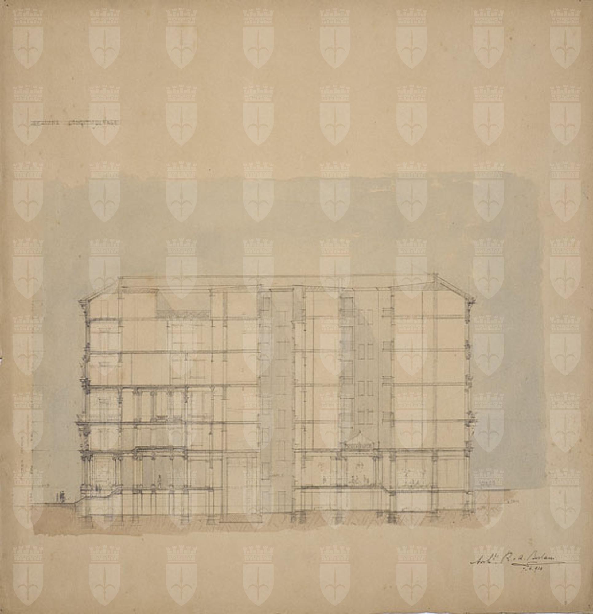 Disegno a matita e acquarellature, raffigurante la sezione longitudinale dell'edificio della Riunione Adriatica di Sicurtà.