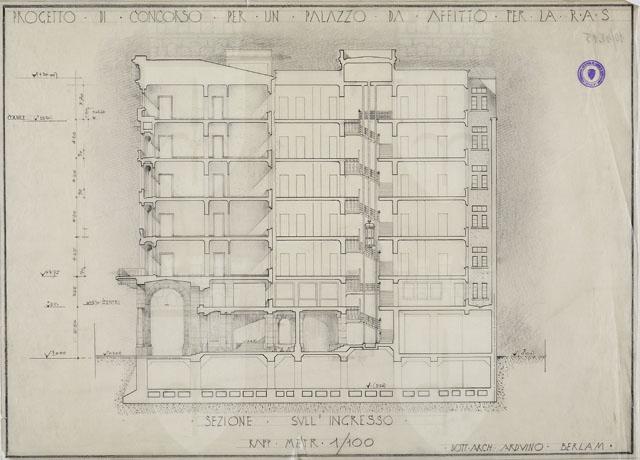 Il disegno in esame appartiene alla serie "Progetto di concorso per un palazzo di affitto per la Riunione Adriatica di Sicurtà, da costruirsi a Trieste in Piazza Oberdan", cfr. schede CMSAOAR10_4207-CMSAOAR10_4218, eseguito da Arduino Berlam. Il 3 febbraio 1934 Arnoldo Frigessi di Rattalma, presidente della Riunione Adriatica di Sicurtà, acquistò l’ultimo lotto disponibile nell’area di piazza Oberdan (pari a 1165 mq) per edificare un palazzo ad uso uffici e abitazioni di alto livello, con l’obbligo di rispettare i vincoli indicati nel piano di sistemazione dell’esedra Oberdan del 1925, per quanto riguardava le facciate e i portici. Lo stesso anno venne indetto un concorso ristretto, cui parteciparono Arduino Berlam, Gustavo Pulitzer-Finali e Umberto Nordio, che risultò vincitore (cfr. Krasovec in Nicoloso, Rovello 2005, pp. 177-179, n. 19).