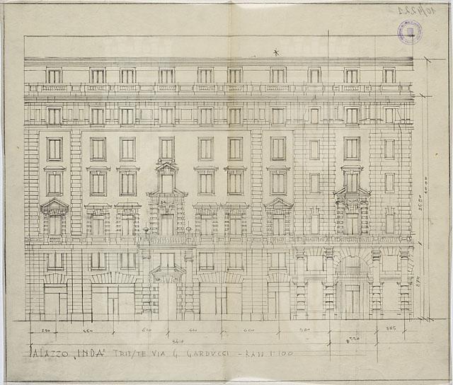 Disegno quotato con incorniciatura; rappresenta il prospetto del palazzo dell’Istituto Nazionale delle Assicurazioni-INA su via G. Carducci e l'angolo smussato su piazza G. Oberdan a Trieste. Scala 1:100.