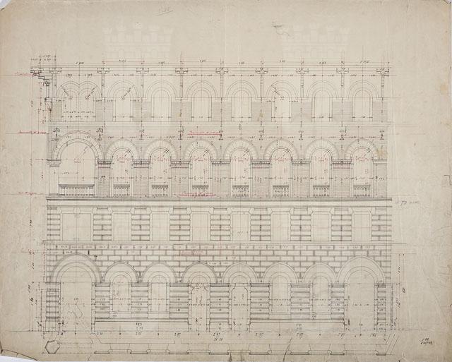 Il disegno è da riferirsi alla progettazione di Casa Leitenburg, cfr. CMSAOAR10_4226-CMSAOAR10_4232. Progettato nel 1887 da Ruggero Berlam per Edoardo de Leitenburg, l’edificio è considerato un capolavoro dell’architetto triestino, formatosi a Brera con Camillo Boito, oltre che un manifesto politico. Si tratta di un edificio di gusto neotuscanico, che divenne modello per innumerevoli edifici abitativi triestini, costruiti fino al 1940, quale esempio di autentica "architettura italiana". L’adozione, infatti, del neo-fiorentino fu “apprezzata da alcuni eminenti triestini che ne valutarono la componente ideologica intesa quale rifiuto dello "stile austriaco" a favore di un’elaborazione autenticamente italiana” (Lorber 2007, p. 80). Si tratta di un edificio equilibrato nel disegno in cui si accoppiano o isolano finestre architravate nel primo piano e a pieno centro nel secondo e terzo, ove sono rimarcate, di contro allo sfondo del cotto, da estradossi quasi archiacuti bicromi. Il disegno in esame illustra la facciata prospiciente la via Rossetti, in cui, eccetto per la soluzione d'angolo, le finestre non compaiono appaiate.