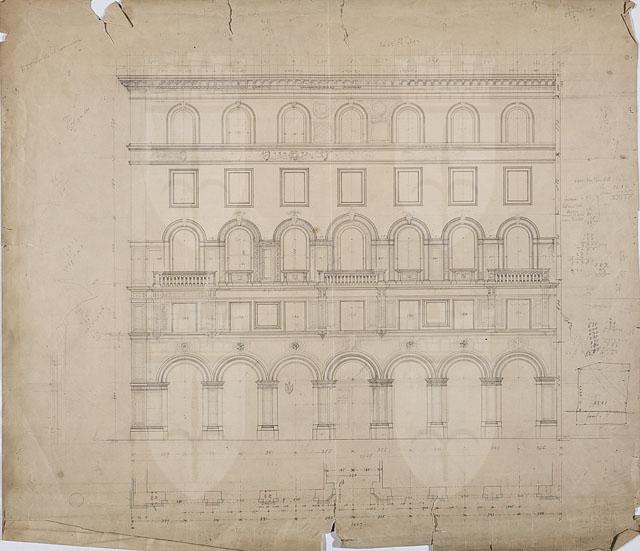 Il disegno fa parte della serie grafica eseguita da Ruggero Berlam per il progetto di una casa di sua proprietà sita in via Giulia 5 - angolo via Piccolomini, Trieste (schede CMSAOAR10_4233 - CMSAOAR10_4239). Si tratta di un edificio d’abitazione, che egli eseguì per profitto, in cui ritorna al linguaggio architettonico rinascimentale, che unisce al recupero del basamento a loggiato di Palazzo Ducale. Inizialmente egli aveva ipotizzato, come si può vedere negli studi grafici, un partito decorativo più ricco (anche cfr. CMSAOAR10_4234) di quello effettivamente realizzato, espresso anche nella ricerca coloristica nel giustapporre parti a bugnato ad altre in muratura (cfr. CMSAOAR10_4235). Tuttavia nelle linee generali il palazzo edificato, considerato dalla critica “la miglior casa per appartamenti e una delle più belle costruite a Trieste alla fine del secolo decimonono” (Pozzetto 1999, p. 110), non si distanzia molto dai progetti grafici. Nel disegno in esame, il palazzo presenta al pianoterra, una sfilata di arconi sorreggenti una teoria di oculi circolari, staccati dal mezzanino con una cornice poco evidenziata. Segue, staccato da un’importante fascia, il piano nobile con finestre e portefinestre (tre i balconi) marcate da paraste con decori a candelabra. Tale decorativismo non interessa le aperture rettangolari nel livello superiore, separate da una larga cornice marcapiano dalle finestre ad arco a tutto sesto con ghiera listellata dell’ultimo livello, sopra le quali si imposta un importante cornicione rinascimentale.