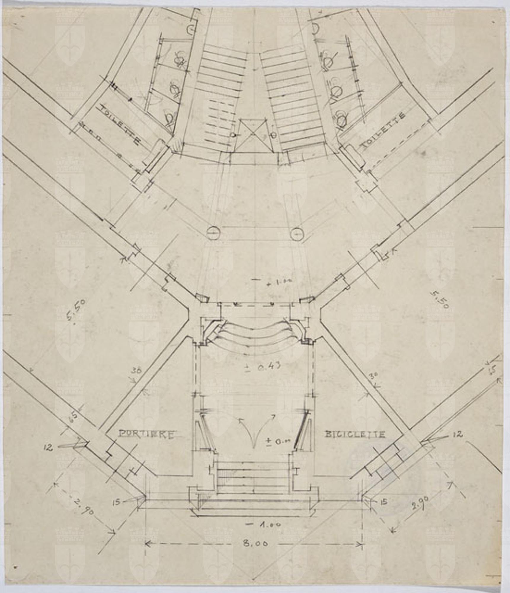Si tratta di uno dei disegni della serie "Progetto per la costruzione della sede dell'Istituto Nazionale d'Assicurazione per gli Infortuni sul Lavoro in via Coroneo" eseguiti da Arduino Berlam, cfr. schede CMSAOAR10_4245 - CMSAOAR10_4271. Nel dicembre 1922 Arduino Berlam venne invitato a partecipare al concorso per la sede dell'Istituto Nazionale d'Assicurazione per gli Infortuni sul Lavoro, che sarebbe stata realizzata in via Coroneo a Trieste. Egli presentò la sua proposta il 14 marzo 1923, che non venne selezionata: fu preferito il progetto degli architetti Enrico e Umberto Nordio. Il foglio contiene la planimetria per l'angolo smussato dell'edificio, caratterizzato per l'accesso principale. Si veda anche il disegno CMSAOAR10_4257 e la tavola definitiva CMSAOAR10_4263.