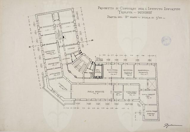 Si tratta di uno dei disegni della serie "Progetto per la costruzione della sede dell'Istituto Nazionale d'Assicurazione per gli Infortuni sul Lavoro in via Coroneo" eseguiti da Arduino Berlam, cfr. schede CMSAOAR10_4245 - CMSAOAR10_4271. Nel dicembre 1922 Arduino Berlam venne invitato a partecipare al concorso per la sede dell'Istituto Nazionale d'Assicurazione per gli Infortuni sul Lavoro, che sarebbe stata realizzata in via Coroneo a Trieste. Egli presentò la sua proposta il 14 marzo 1923, che non venne selezionata: fu preferito il progetto degli architetti Enrico e Umberto Nordio. La tavola in esame illustra la planimetria definitiva del II piano, in cui l’area dedicata agli uffici è nettamente separata a quella destinata ad abitazione per un funzionario dell’istituto. Vi è inoltre una cella-valori sussidiaria, che Berlam ipotizzava eseguita in “ferri a I, riuniti fra loro con cantonali, specialità della Ditta Antonio Parma di Saronno” (cfr. relazione allegata).