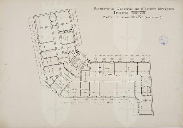 Si tratta di uno dei disegni della serie "Progetto per la costruzione della sede dell'Istituto Nazionale d'Assicurazione per gli Infortuni sul Lavoro in via Coroneo" eseguiti da Arduino Berlam, cfr. schede CMSAOAR10_4245 - CMSAOAR10_4271. Nel dicembre 1922 Arduino Berlam venne invitato a partecipare al concorso per la sede dell'Istituto Nazionale d'Assicurazione per gli Infortuni sul Lavoro, che sarebbe stata realizzata in via Coroneo a Trieste. Egli presentò la sua proposta il 14 marzo 1923, che non venne selezionata: fu preferito il progetto degli architetti Enrico e Umberto Nordio. La tavola in esame illustra la planimetria definitiva del III e IV piano. Essa non presenta modifiche sostanziali rispetto allo schizzo CMSAOAR10_4249, alla cui scheda si rimanda per ulteriori considerazioni.