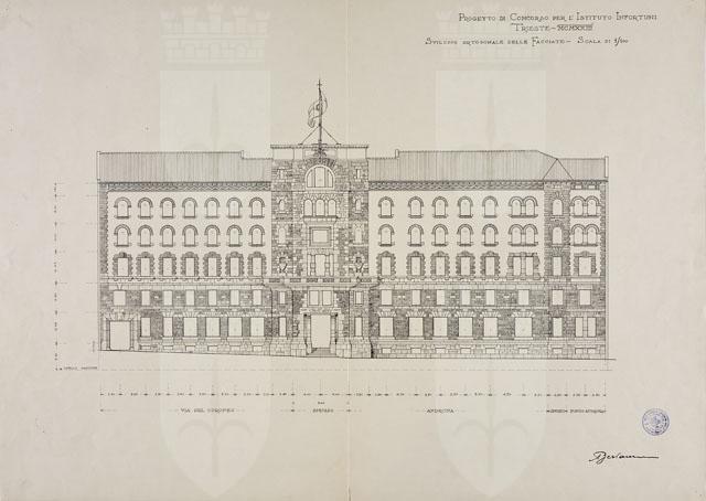 Si tratta di uno dei disegni della serie "Progetto per la costruzione della sede dell'Istituto Nazionale d'Assicurazione per gli Infortuni sul Lavoro in via Coroneo" eseguiti da Arduino Berlam, cfr. schede CMSAOAR10_4245 - CMSAOAR10_4271. Nel dicembre 1922 Berlam venne invitato a partecipare al concorso ristretto a inviti per la sede dell'Istituto Nazionale d'Assicurazione per gli Infortuni sul Lavoro, che sarebbe stata realizzata in via Coroneo. "Il bando prescriveva il perimetro dell'edificio e determinava l'esatta quadratura di ogni singolo ambiente, in base a un progetto elaborato in precedenza dal fiduciario tecnico dell'Istituto. Erano prescritte altresì l'altezza dei piani e varie altre esigenze, di modo che meglio risolveva il problema chi maggiormente s'avvicinava al progetto base" (Berlam 1923). Arduino Berlam presentò la sua proposta il 14 marzo 1923, che non venne selezionata: fu preferito il progetto degli architetti Enrico e Umberto Nordio. Il disegno in esame illustra il prospetto dell'edificio. Berlam propone un ampio uso del bugnato a blocchi rettangolari lavorati grossolanamente per ricoprire il livello sotterraneo, il piano terra e il primo piano dell’edificio, per gli smussi, oltre all’uso quali conci per inquadrare le finestre degli altri piani elevati. Nella relazione di corredo al progetto l’architetto suggerisce l’uso della pietra calcarea di Aurisina e dell’arenaria azzurognola di Muggia, “opportunamente alternate e armonizzate”. Nel disegno l’arenaria è indicata con il tratteggio, la pietra calcarea a punteggiature. I fondi di muro del secondo, terzo e quarto piano “saranno d’intonaco di malta […] trattato a cazzuola e quindi tinteggiato a calce in colore bianco-avorio per dare spicco alla pietra oscura”. Sotto la linda aveva ipotizzato un fregio a colori per “dare un po’ di brio alla facciata, che altrimenti sarebbe un po’ troppo severa” (cfr. Relazione allegata).