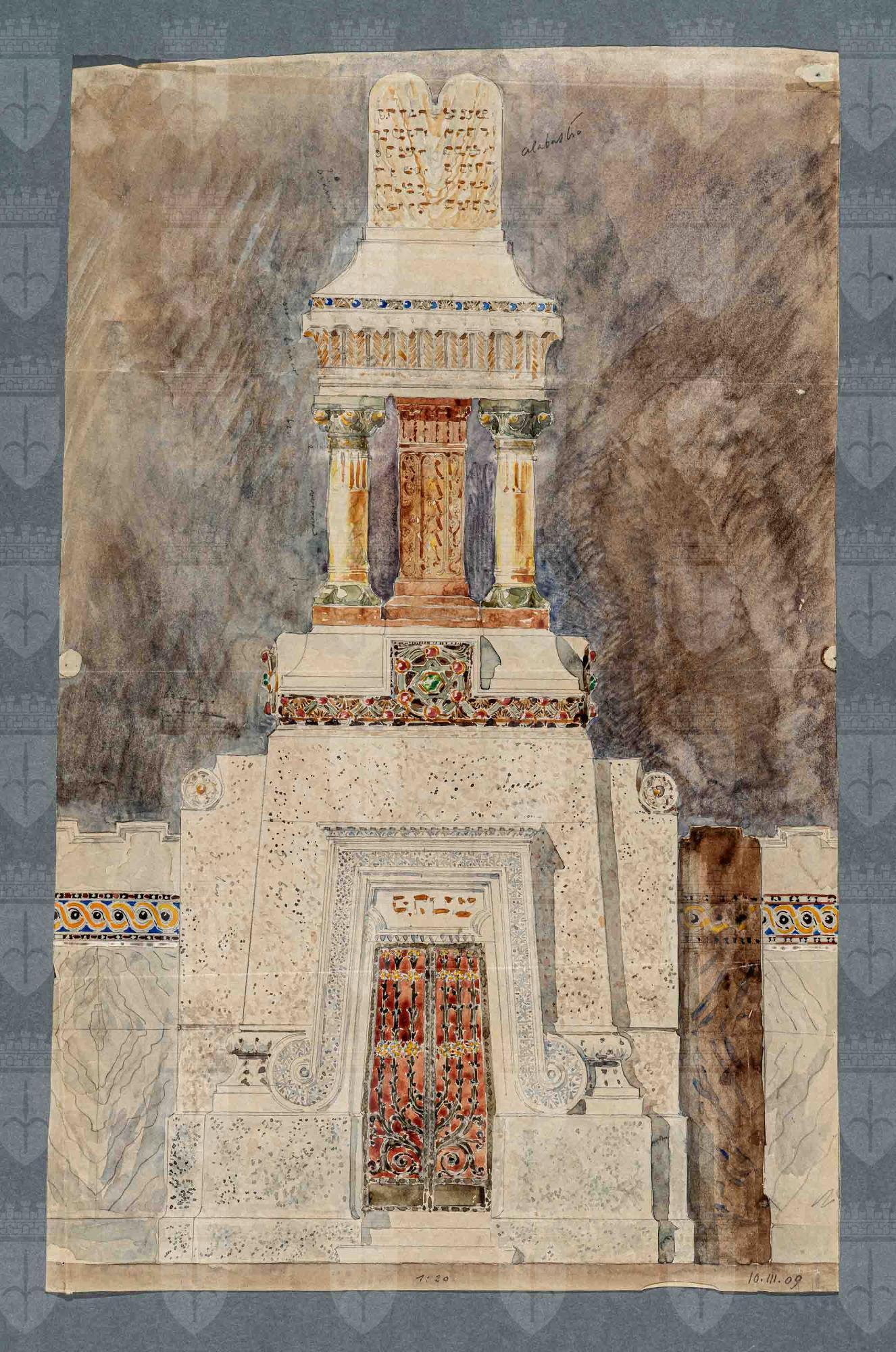 Il disegno in esame è il bozzetto preparatorio dell'Aron ha Qodesh, l'Armadio Sacro; riporta anche la scala 1:20 e alcune indicazioni su colori e materiali (ad esempio alabastro, bianco, oro).