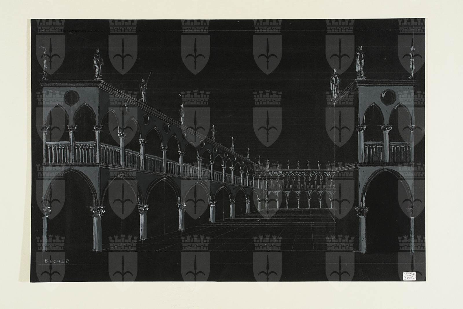 Otello di Giuseppe Verdi, bozzetto scenografico, atto 3., Cortile d'onore porticato con due ordini di colonne