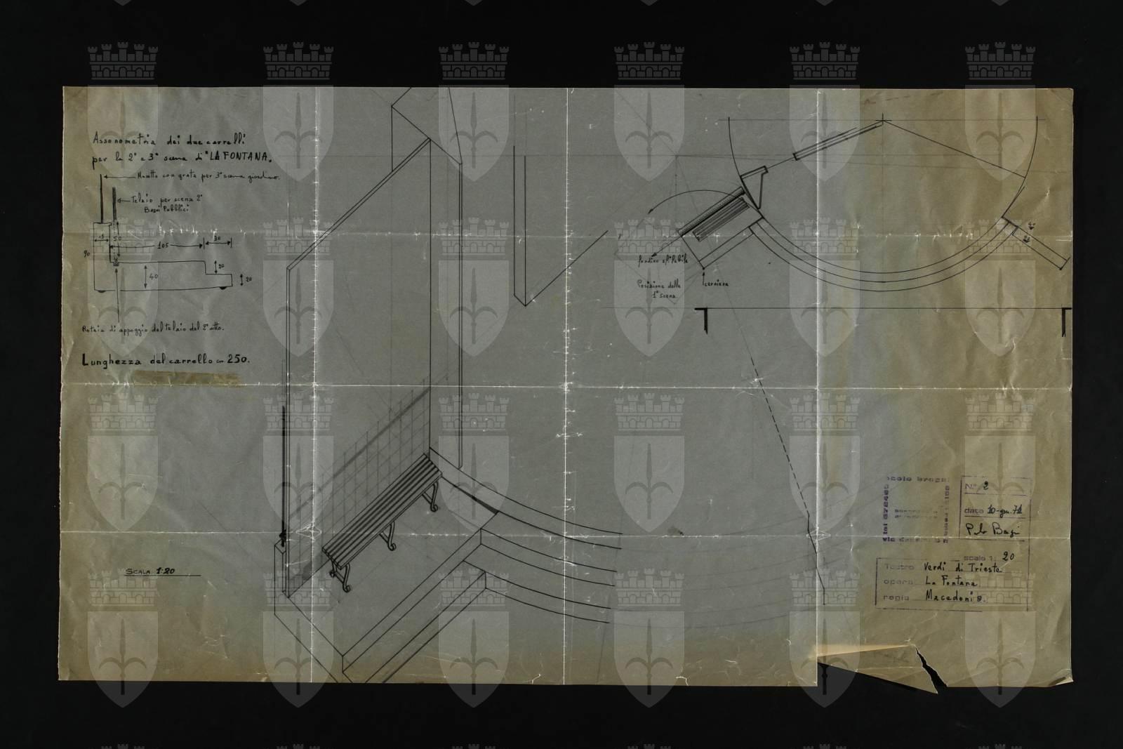 La fontana, opera di Mario Bugamelli. Assonometria dei due carrelli per la 2. e 3. scena
