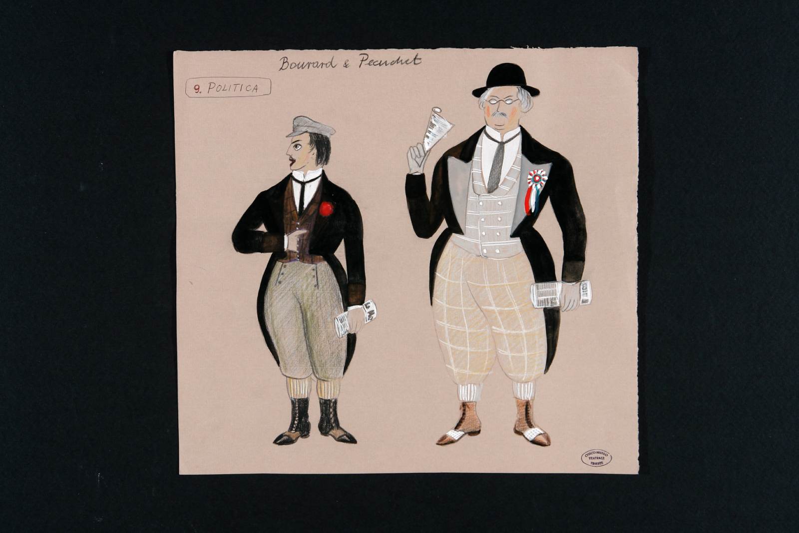 Bouvard e Pecuchet di Tullio Kezich e Luigi Squarzina da Gustave Flaubert. Personaggi: Bouvard e Pecuchet. Due figure maschili intere vestite da politici. la figura di sinistra indossa berretto con frontino, camicia, cravattino, gilè, giacca a coda di rondine, garofano all'occhiello, pantaloni al ginocchio, calzettoni, stivaletti, porta nella mano sinistra un giornale. La figura di destra indossa bombetta nera, camicia, cravatta, coccarda, gilè rigato, giacca a cosa di rondine, coccarda tricolore, pantaloni a quadri al ginocchio, calzettoni, stivaletti bicolore, porta in ciascuna mano un giornale