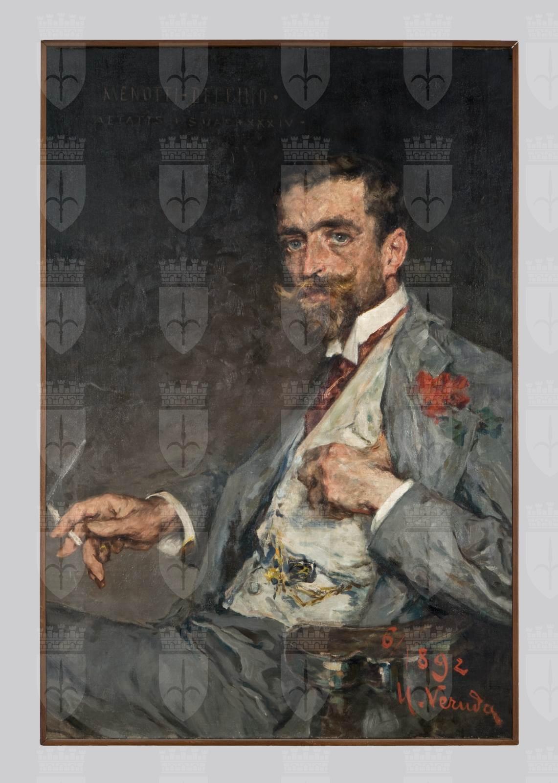 DELFINO, Domenico Giovanni Battista, detto Menotti (Fiumicello 1858-Trieste 1937). Il dipinto venne esposto nella angusta galleria Schollian, dove era possibile vederlo riflesso nello specchio, accanto all' uscita (Silvio Benco, in Vernice, 1946 p.1). Venne recensito al tempo come una delle migliori opere realizzate da Veruda per l' intonazione della luce, per la quiete espressione anche se la tecnica nell' impasto delle tinte è un po' dura ed ardita e le mani hanno del rude e dell' incompleto. E' una pittura che va guardata da lontano. Il ritratto raffigura il baritono Menotti all'età di 34 anni in elegante abbigliamento; sul panciotto è appuntata una catena da orologio in oro impreziosita da un medaglione con monogramma; al bavero un fiore rosso. Il dipinto inaugura una lunga serie di ritratti di personaggi celebri. Frequente nell' opera artistica di Veruda è l'accostamento del ritratto del personaggio in una posa disinvolta ed apparentemente poco studiata ad una fumante sigaretta.