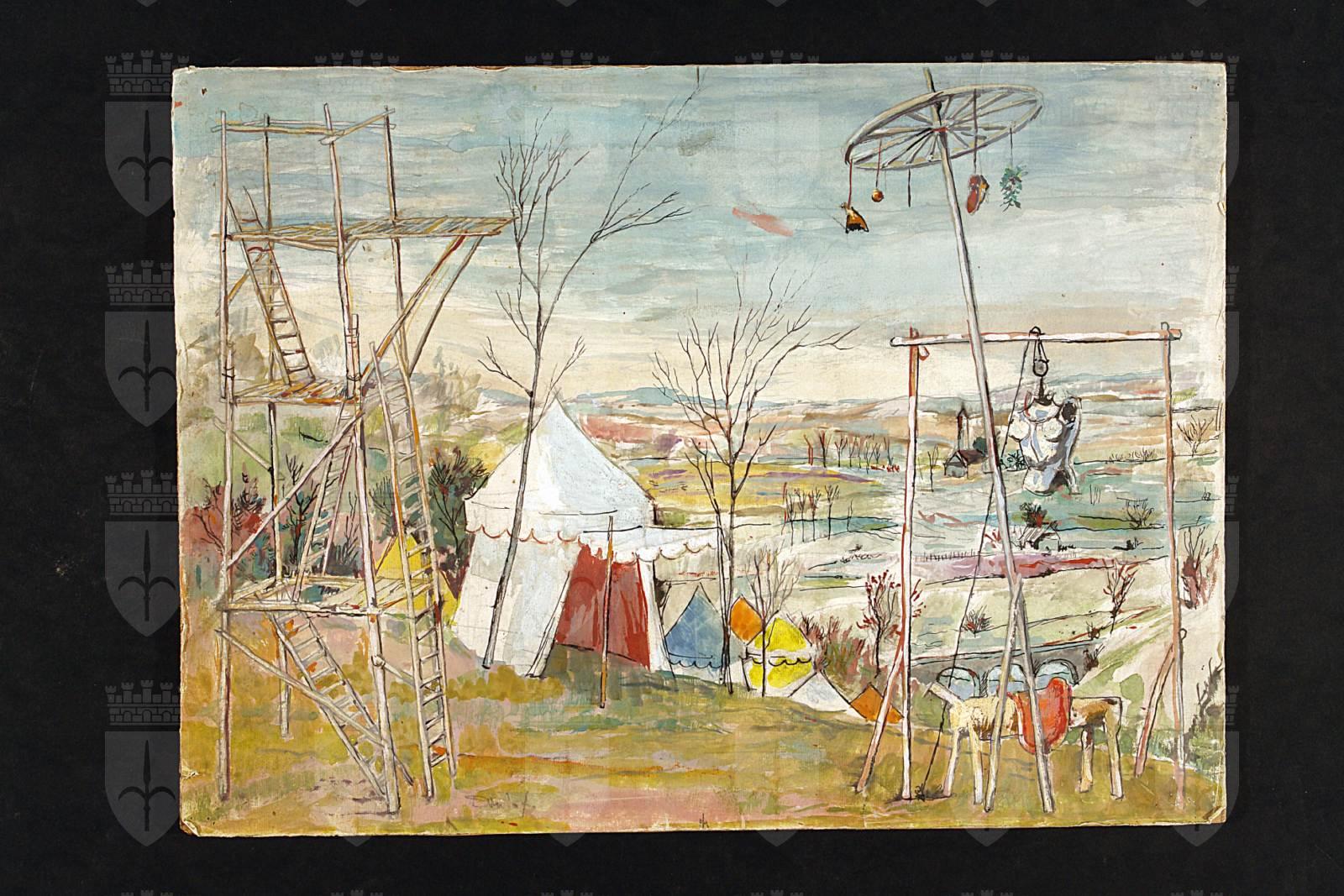 I dadi e l'archibugio, di Alfredo Balducci, regia di Sergio Velitti, paesaggio con accampamento e impalcatura in legno