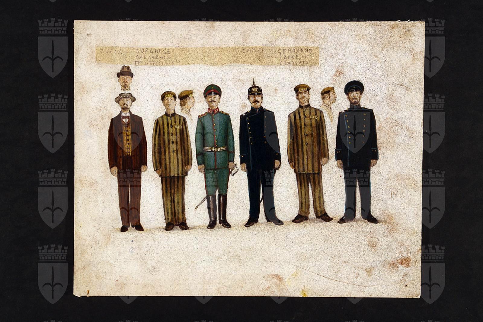 Il capitano di Köpenick di Carl Zuckmayer. Figure maschili intere, da sinistra: borghese, ufficiale, carcerato, gendarme, carcerato, graduato.