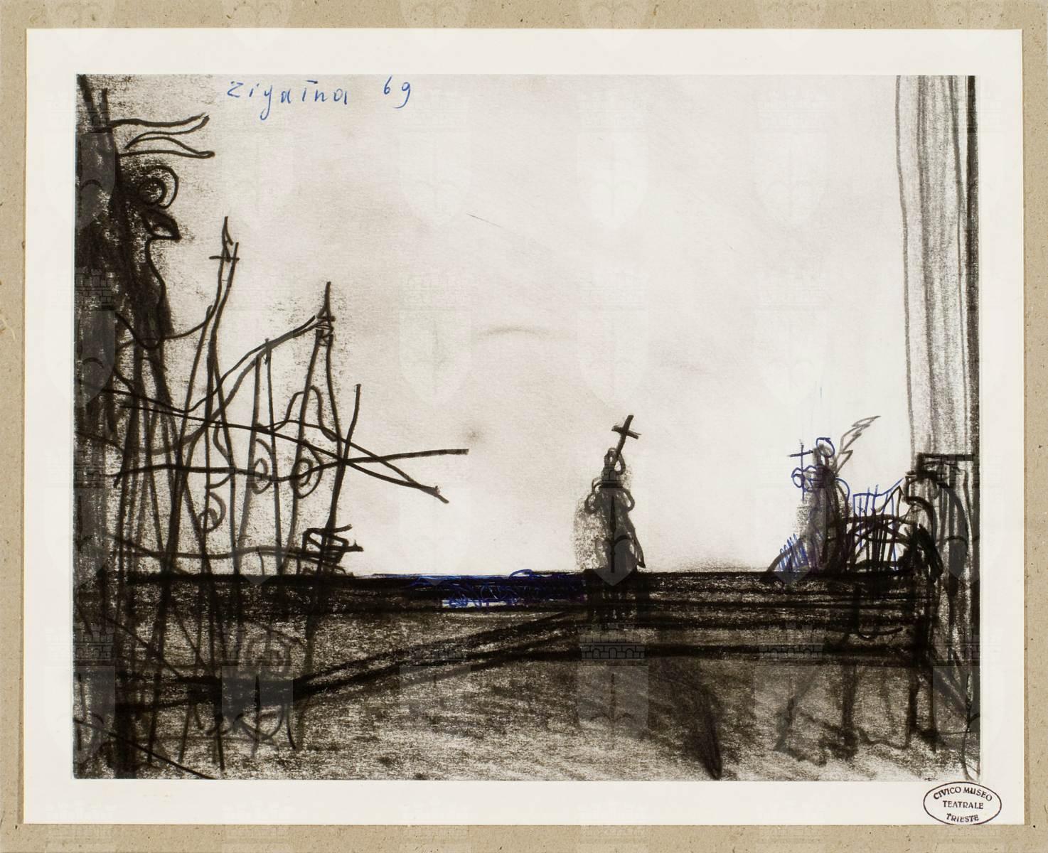 Bozzetto scenografico per Il convitato di pietra, opera di Aleksandr Sergeevič Dargomyžskij, prima rappresentazione 6 marzo 1969, nuova per Trieste, Teatro Comunale Giuseppe Verdi Trieste, regia di Carlo Piccinato