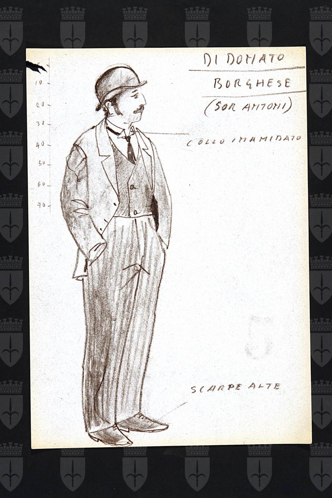 Motivo di scandalo e di riflessione, due tempi di John Osborne. Figura maschile intera di 3/4 con giacca, calzoni rigati, panciotto, bombetta, camicia e cravatta