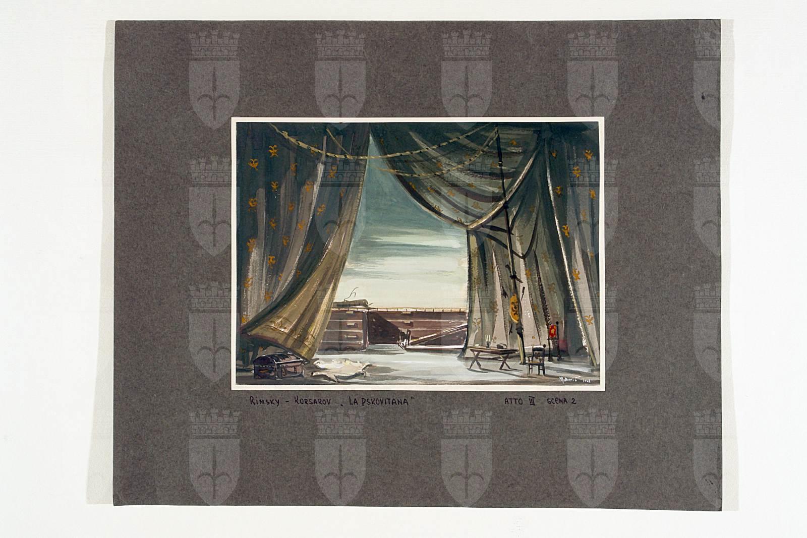 Bozzetto scenografico per Pskovitianka (Ivan il terribile), opera di Nikolaj Andreevič Rimskij-Korsakov, prima rappresentazione 13 gennaio 1968, Teatro Comunale Giuseppe Verdi Trieste, regia di Mladen Sablic