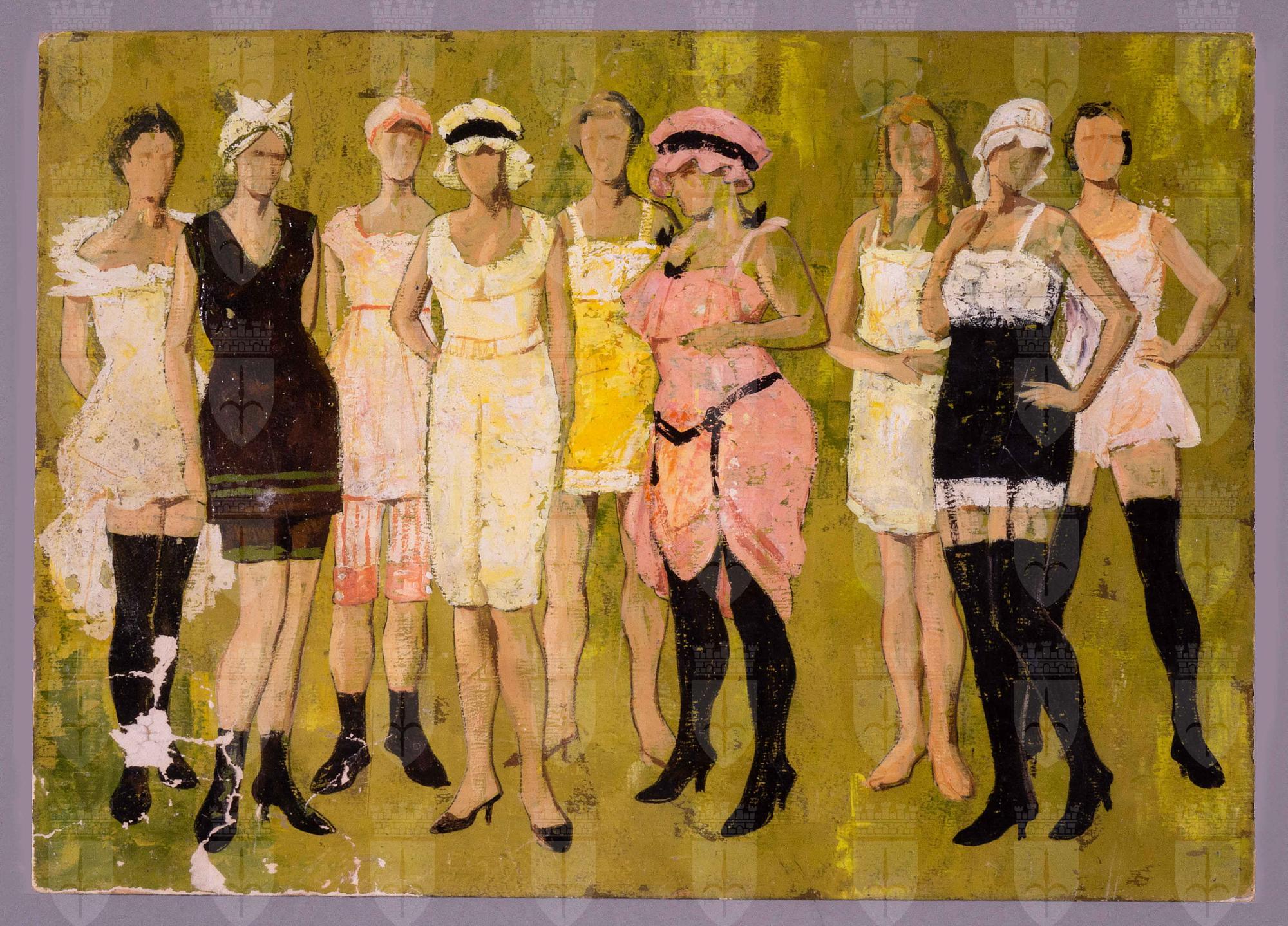 L'opera da tre soldi, di Bertolt Brecht e Kurt Weill, regia di Giorgio Strehler. Figurino di gruppo di nove figure femminili in biancheria intima di svariate fattezze, su toni del nero, bianco, rosa e giallo, sfondo verde oliva.